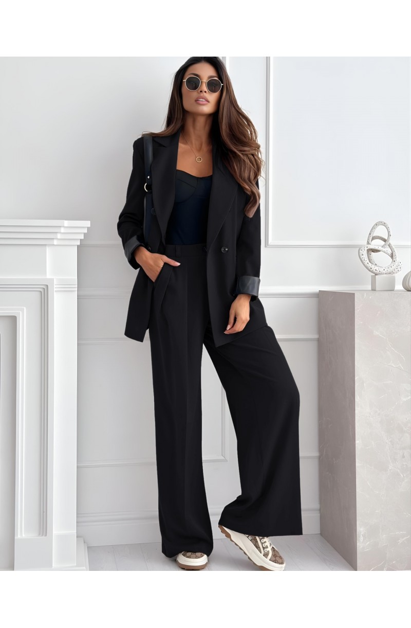 Γυναικείο κουστούμι , με σακάκι Blazer με γύρισμα δέρμα στο μανίκι , και παντελόνι φαρδιά γραμμή με πιέτα , ψηλόμεσο ! Ένα νούμερο , ταιριάζει σε S ,M , L.