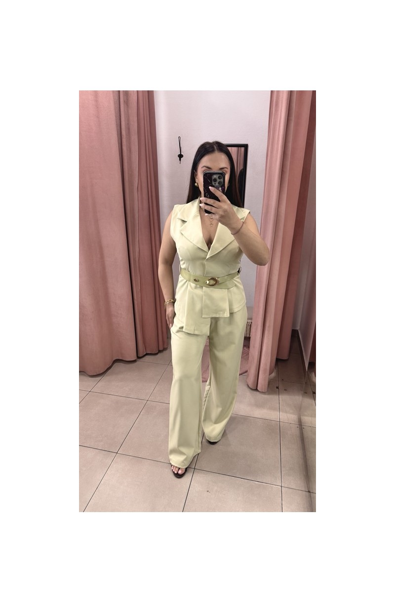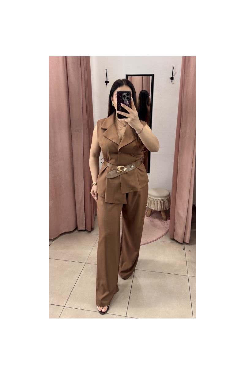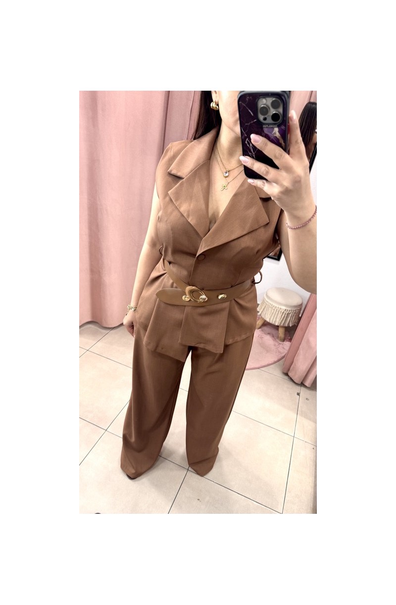 Γυναικείο κοστούμι με γιλέκο σε δυο χρώματα καφέ και πράσινο M-L-XL. Το παντελόνι έχει πιέτα κουμπί και λάστιχο στο πίσω μέρος