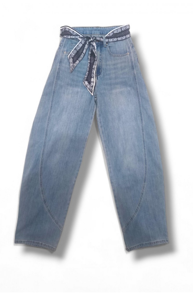 χτό μπλε χρώμα, το οποίο χαρακτηρίζεται από τις ιδιαίτερες καμπυλωτές ραφές στα μπατζάκια και τη χαλαρή γραμμή που στενεύει ελαφρώς στο τελείωμα. Στην εικόνα σας, συνδυάζεται με μια ζώνη-φουλάρι με λαχούρια (paisley pattern).