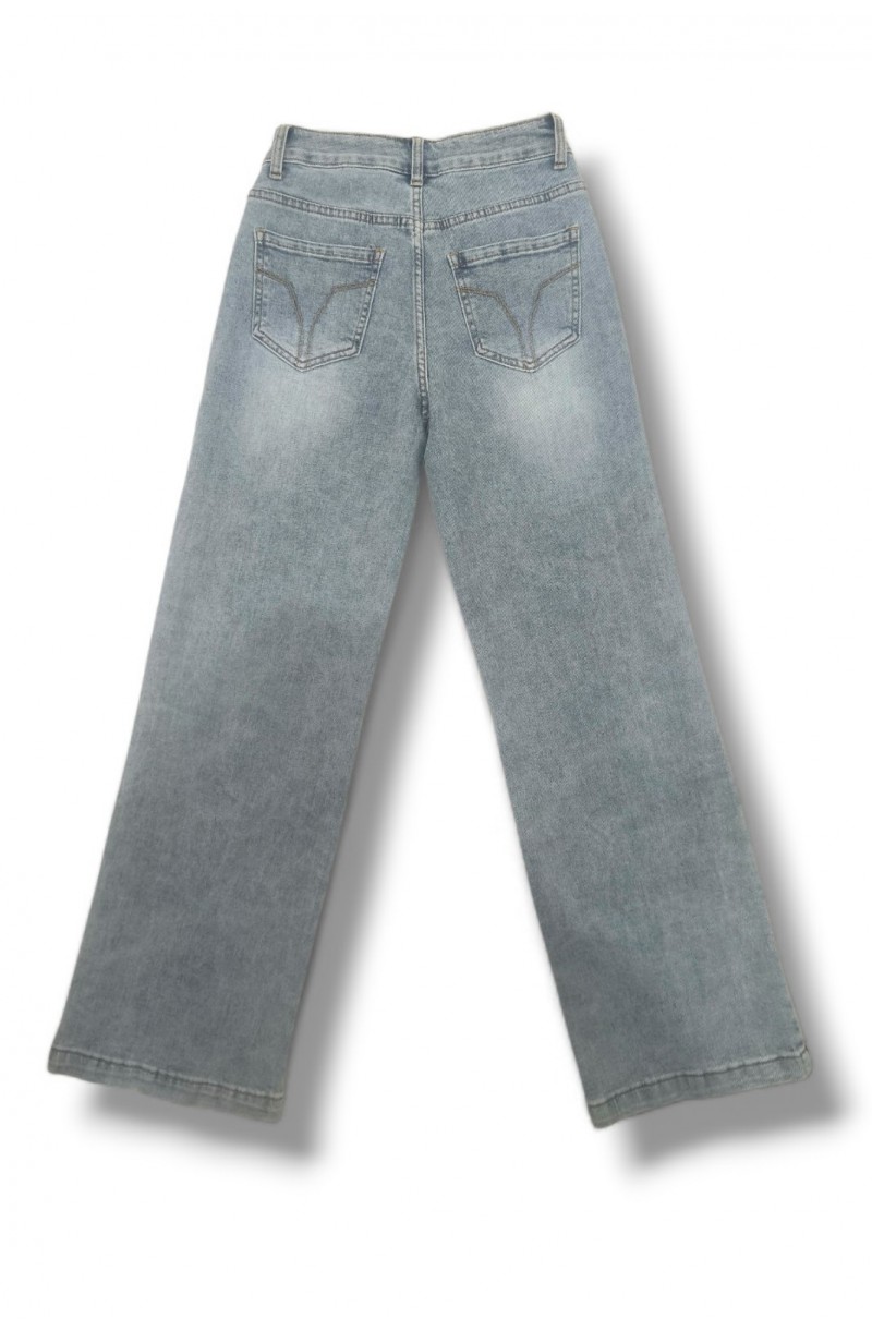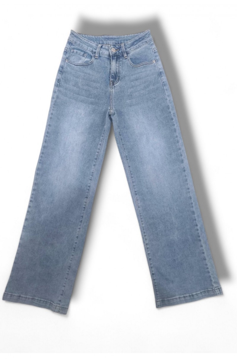 τζιν παντελόνι που εμφανίζεται στην εικόνα είναι σε wide leg γραμμή με ψηλή μέση, σε ανοιχτόχρωμη μπλε απόχρωση.