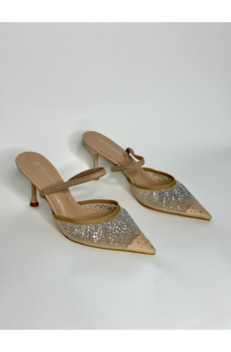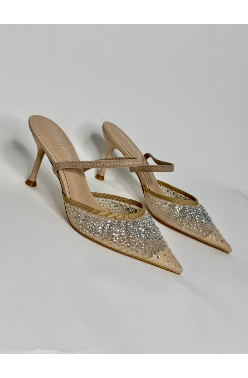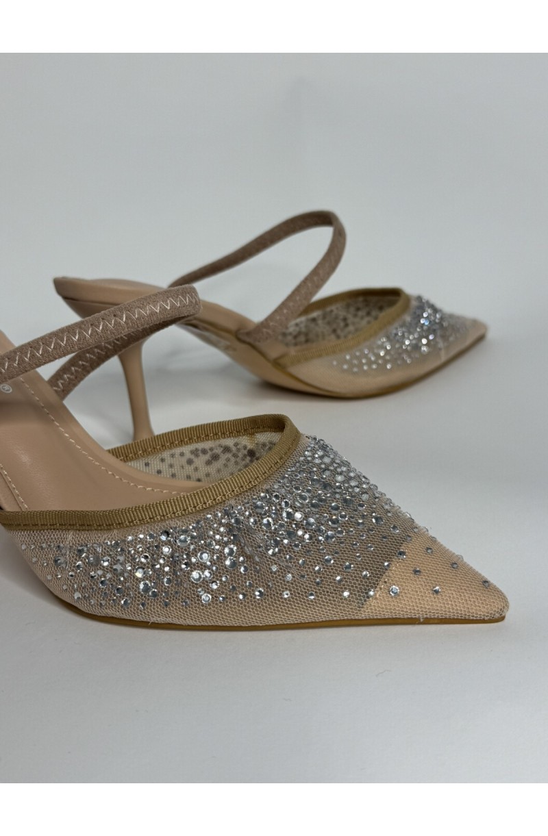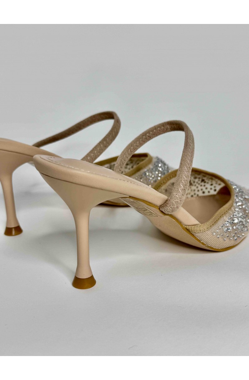 Γυναικεία nude γόβα με στρας, καλοκαιρινή με χαμηλό τακούνι